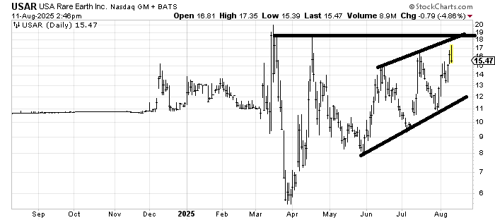 USA Rare Earth USAR looks to me like it was a SPAC at some point and has traded a bit wildly since coming to market. The pattern I see is that it is making higher lows and higher highs, but the higher highs have very little follow-through. If it pulled back to the lower line, the risk/reward would be good.