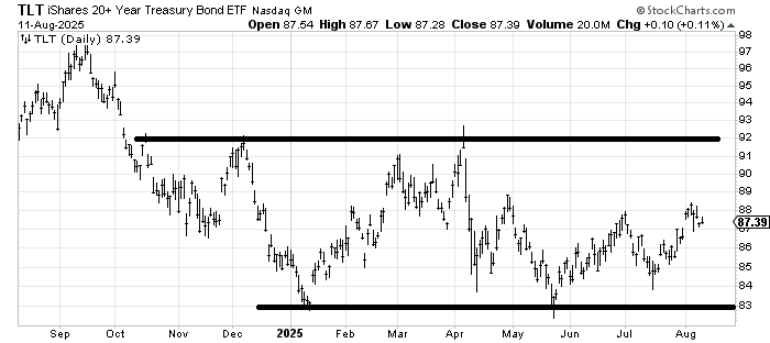 Tomorrow we’ll see the CPI. The last several months have seen it come in less than expected. I look at the chart of TLT, and I don’t even have a sense of what it might be. I continue to think TLT is in a trading range. The low 80s is support and the low 90s is resistance, so if the CPI is higher than expected and TLT falls, I suspect we’ll be looking to buy it later in the week. If it is less than expected and the TLT rallies, I suspect we’d be looking at some profit taking if it can get to the low 90s.