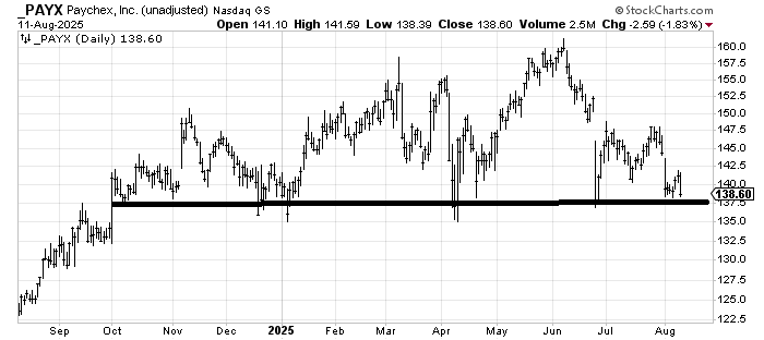 There was a time that Paychex PAYX was a market darling. From the looks of the chart, it has not been one in a long time. But if this stock breaks down, that will be one giant top it has broken from.