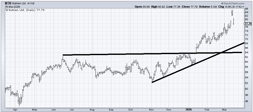 Nutrien (NTR) is a stock I have liked for just over two years now, but the action today has moved me to the sidelines. That now looks like an island top, those two days trading either side of 84. It’s always possible it won’t matter, but it’s been a great run, so I don’t mind being sidelined now.