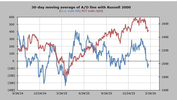 The 30-day moving average of the advance/decline line looks oversold, but the math says ‘not so fast’. Nasdaq’s, though, is oversold. There’s the Either/Or market again.