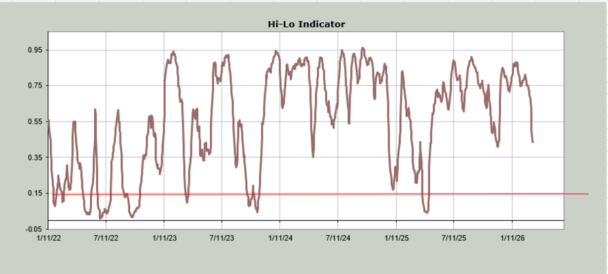 The same is true for Nasdaq’s Hi-Lo Indicator. Only it is at .27 so it is much closer to getting to an extreme oversold condition. Oddly enough, Nasdaq often gets oversold just under .19, although you can see it often goes lower than that before being solidly oversold.