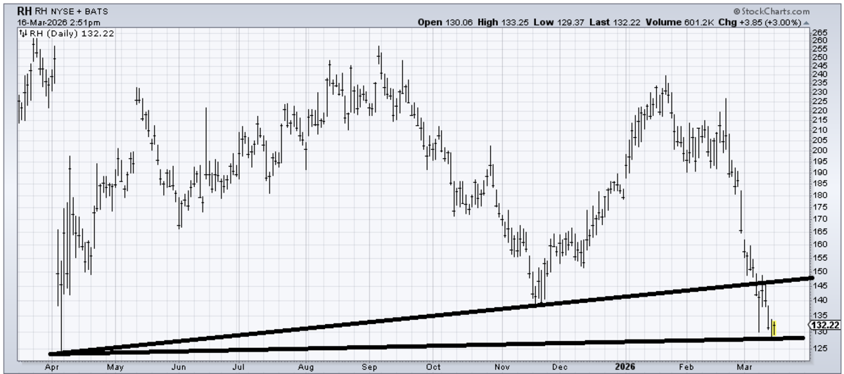 I am inclined to think RH (RH) rallies from here. I am also inclined to think that it runs into some trouble in the 140-145 area. But that is a long fall it has taken since mid January, and that looks to me like an oversold stock.