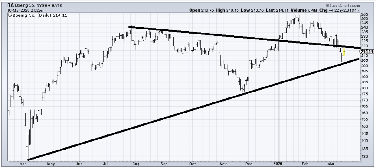 I had thought the upper line on Boeing (BA) would hold on this trip down, and I was very wrong. For now, the lower line (probably the one more folks would draw in) has held. Therefore, the big test is if it can get itself back up over 220 during this oversold rally. If it can, then BA should be okay.
