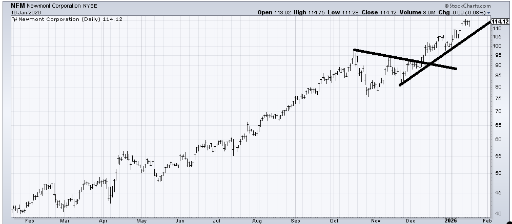 Newmont (NEM) has a measured target in this 115-120 area. I have thought gold and gold stocks needed a correction, and I have been wrong. That having been said, I would use that uptrend line as a guide: break that, and something has changed.