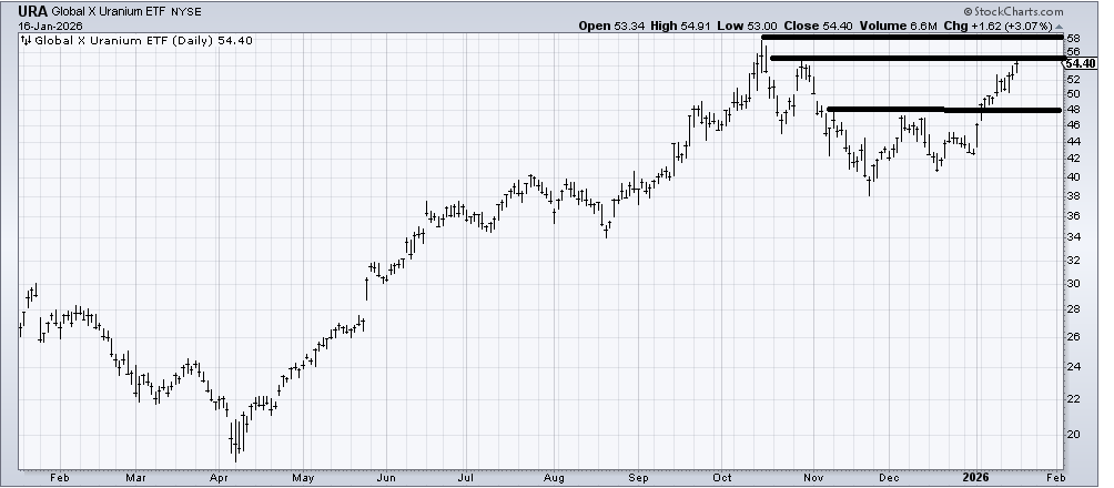 (URA) , an ETF to be long Uranium, is at resistance (55-58), so it could use a pullback. There is a theme here: stocks are overbought and could use a pullback! I am not a buyer here, but would prefer to see a pullback or sideways move to digest and then see where it stands. I suspect dips will be/should be bought.