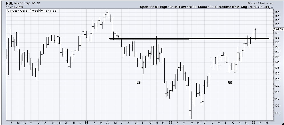 I am using the weekly chart of Nucor (NUE) , a stock I recommended months ago based on the head and shoulders bottom that had set up. The next measured target is 180-185. There is a possibility of a longer-term target in the 210 area, but there is a gap to fill around 180 and the high at 195 to contend with first. I doubt it will be a straight line, and since it is a mostly straight line since October, I imagine the first quarter brings a correction.