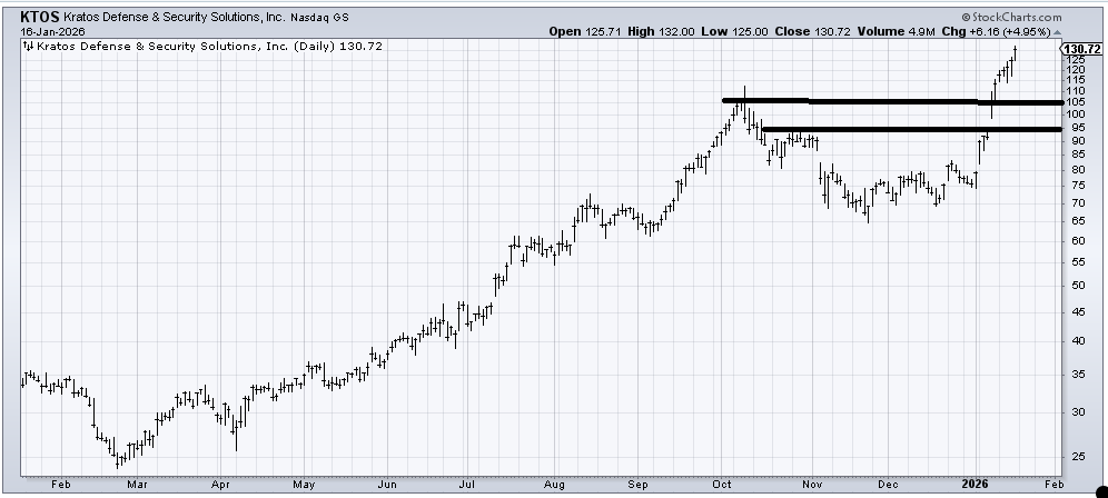 Kratos Defense & Security (KTOS) has been terrific. It is way over-extended because it has had exactly one red day (barely) since the calendar turned to 2026. There is also a short-term measured target in this 130 area. Mostly, it just needs a pullback.