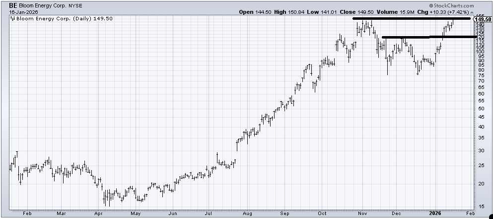 Bloom Energy ( (BE) ) is overbought and at resistance, but if it can break out, it has a next measured target around 160. Support, though, is far away at 120-ish.