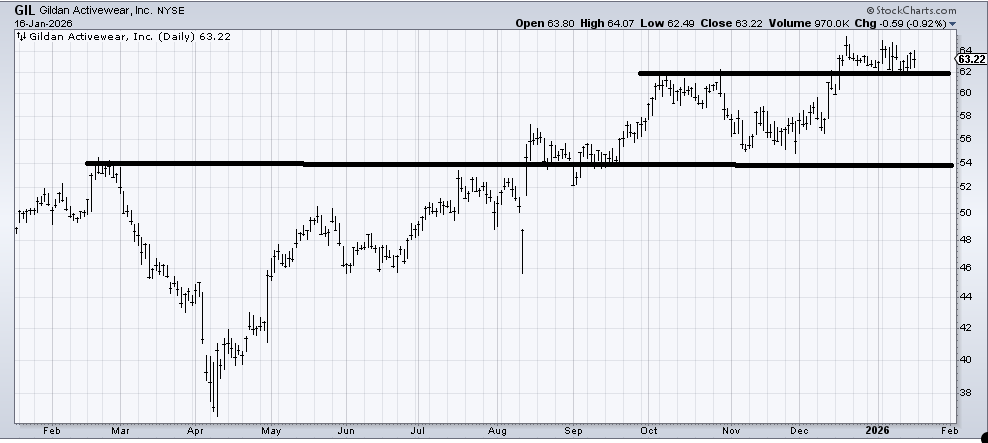 Gildan Activewear (GIL) has a measured target in the 68-70 area, so as long as it doesn’t crack under 62 too far, that’s where I would expect it to get to.