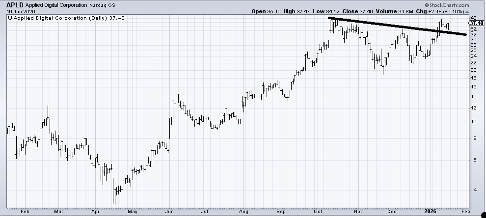 I would expect Applied Digital (APLD) to have some trouble at the old high of 39-40, but overall, as long as it stays over this line, the stock should work higher.