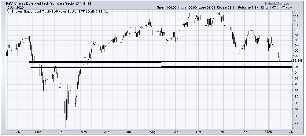 One area folks are not terribly interested in buying the dip is software. It has now been red for four straight days and is at the top of my support zone. I do expect a short-term bounce from this area. But as I said last week, this is a top, and we should not sugarcoat it. I would love to see what I call a Realization Day, where all of a sudden everyone has the same reason as to why it is down, and no one wants to bottom fish it. Maybe that arrives early this coming week.