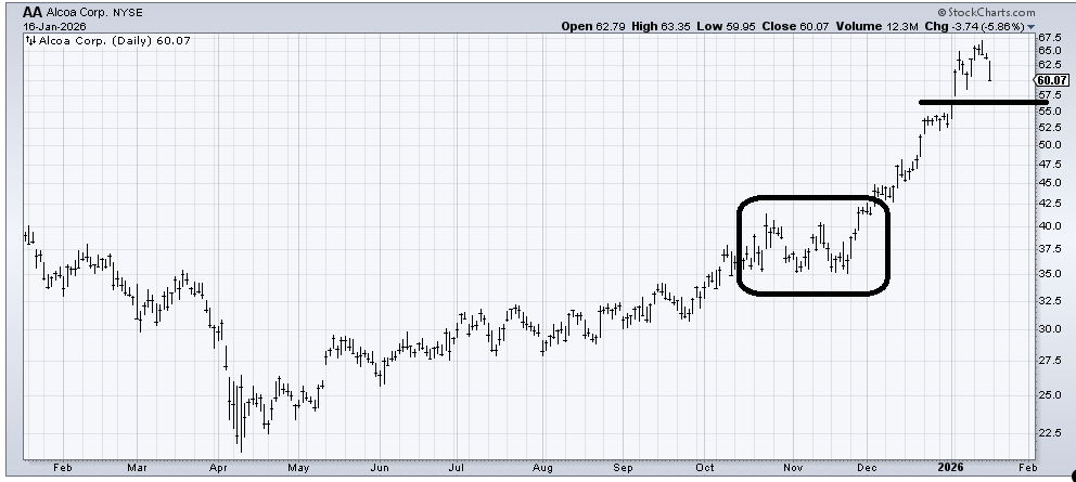 I was asked where to buy Alcoa (AA) back. As a reminder, I turned bullish on this chart last summer, and recently, when the stock was in the mid-50s, I thought it was ‘enough’ and time for a correction. It obviously didn’t care as it went on to 67, but it finally fell on Friday.
