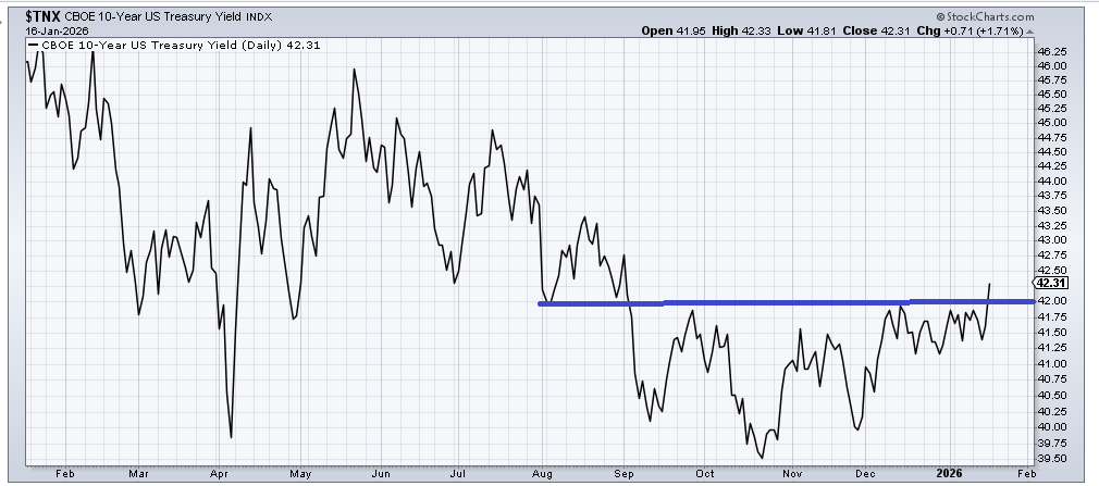 The yield chart shows a clear breakout, albeit right into resistance.