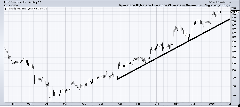 I believe every time I get asked about Teradyne (TER) , my answer is the same: it’s an up chart that hasn’t done anything wrong. To do something wrong, it would have to break that uptrend line. Does it need a correction? Yes. Back to the line would be helpful.