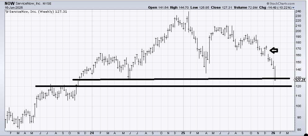 I decided to use the weekly chart of ServiceNow (NOW) because the stock is down so much. It is definitely getting oversold. And it is into support in the 120-127 area. However, note that the weakness has been persistent since gapping down in the early part of December (arrow). There has been no bounce back at all. That shows overall weakness and is in keeping with my comment above that the software charts are big tops. So a bounce soon, but that’s all I see.