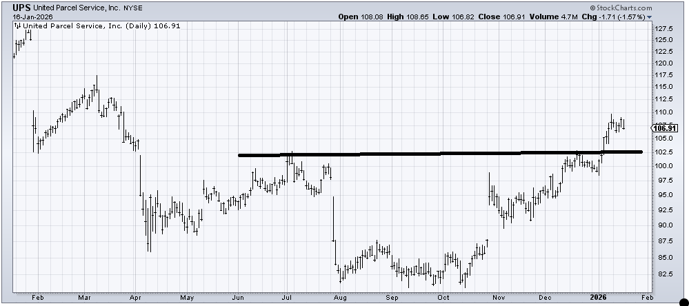 I have been bullish on United Parcel (UPS) since I warmed up to the Transports in September/October. There is a measured target in the 120-125 area, and you can see the gap would fill at 125. In the near term, I’d prefer to see the chart pullback to that 102-103 area to test the breakout. Also, I think that 117 high from March is going to be a problem the first trip up there.