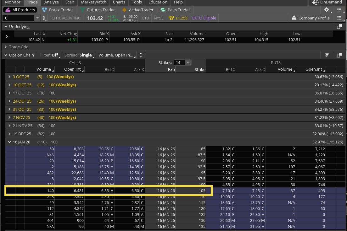 Option Trade: With only a few months left to go in 2025 I am looking at some near the money strikes on Citigroup. My preference would be in the money but the stock is in the middle of two strikes.
