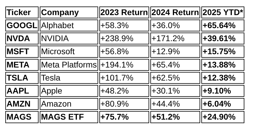 Magnificent Seven Total Returns (2023–2025)