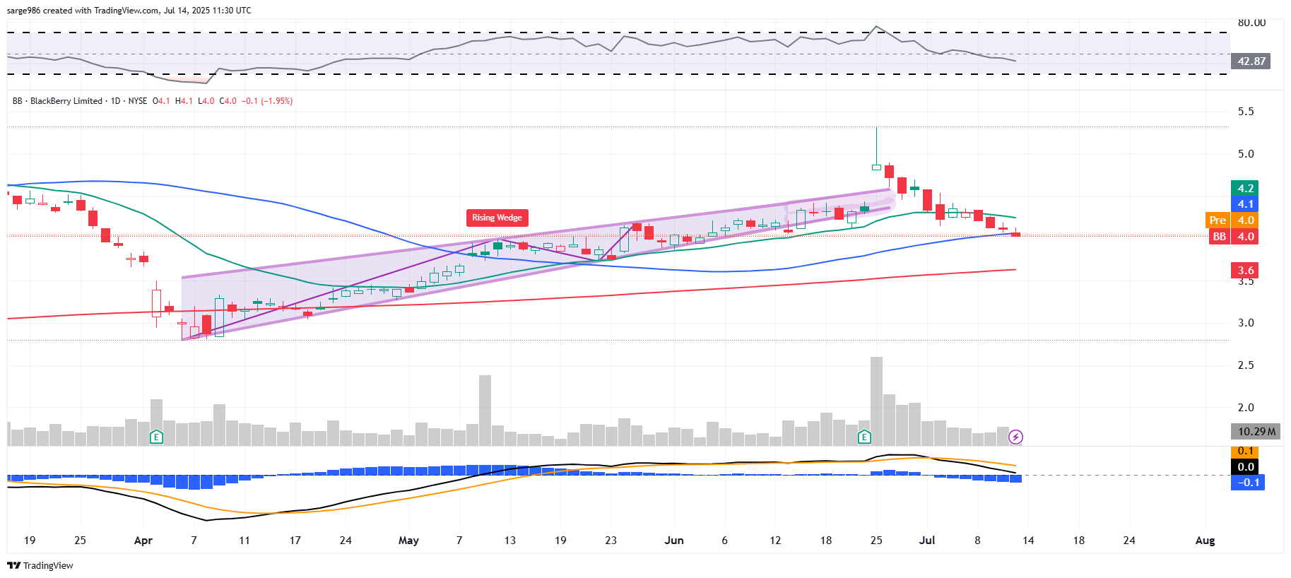 Readers will see that BB has broken down from a rising wedge of bearish reversal ​despite a bout of post-earnings algorithmic buying that may have had some short covering behind it as it looks to have run out of steam quickly. The stock ended the Thursday session making use of its 50-day SMA as support. On Friday, the level was pierced to the downside, but contact was not broken. On Monday morning, we are seeing an attempt to retake the level.