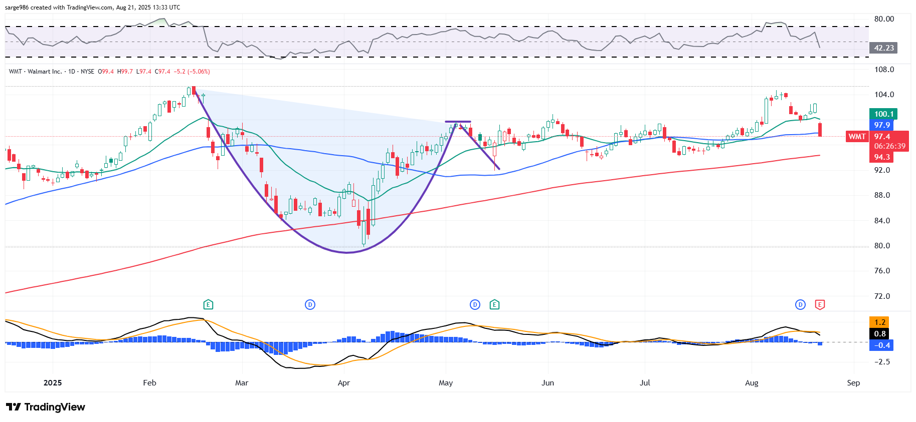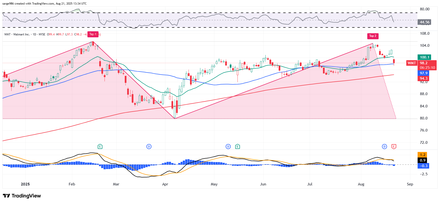 Now, what do you have? A double-top pattern if bearish reversal with an $80 million pivot. That's what. That's also ugly. It is imperative for the Walmart bulls to hold the 50-day SMA at $98. If that line cracks, risk managers will force portfolio managers to reduce exposure, and professionals will start hitting bids.