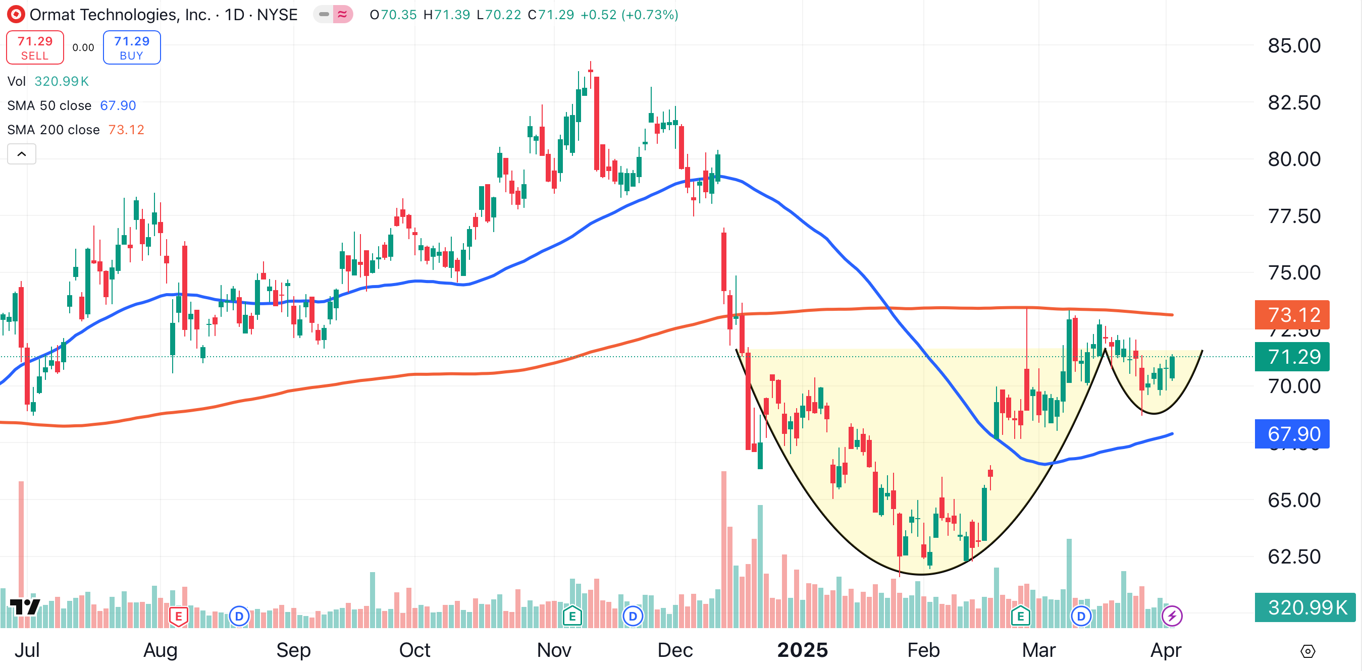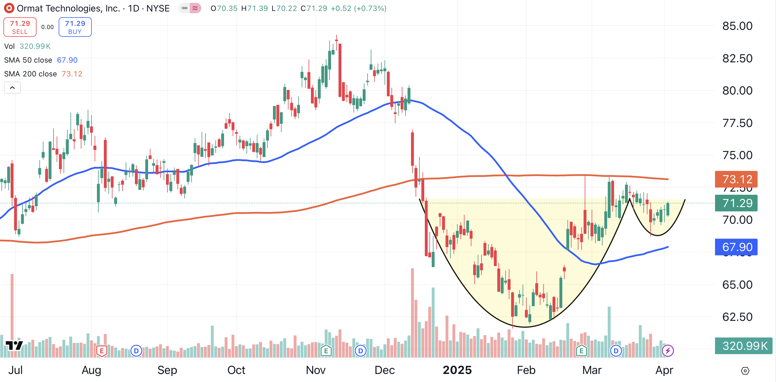 Ormat Technologies has gained just 3% year-to-date, but while the stock has been consolidating, it has formed a cup and handle pattern (shaded yellow). This bullish pattern suggests Ormat could climb to $80 per share. First, the stock will have to climb above its 200-day moving average (red).
