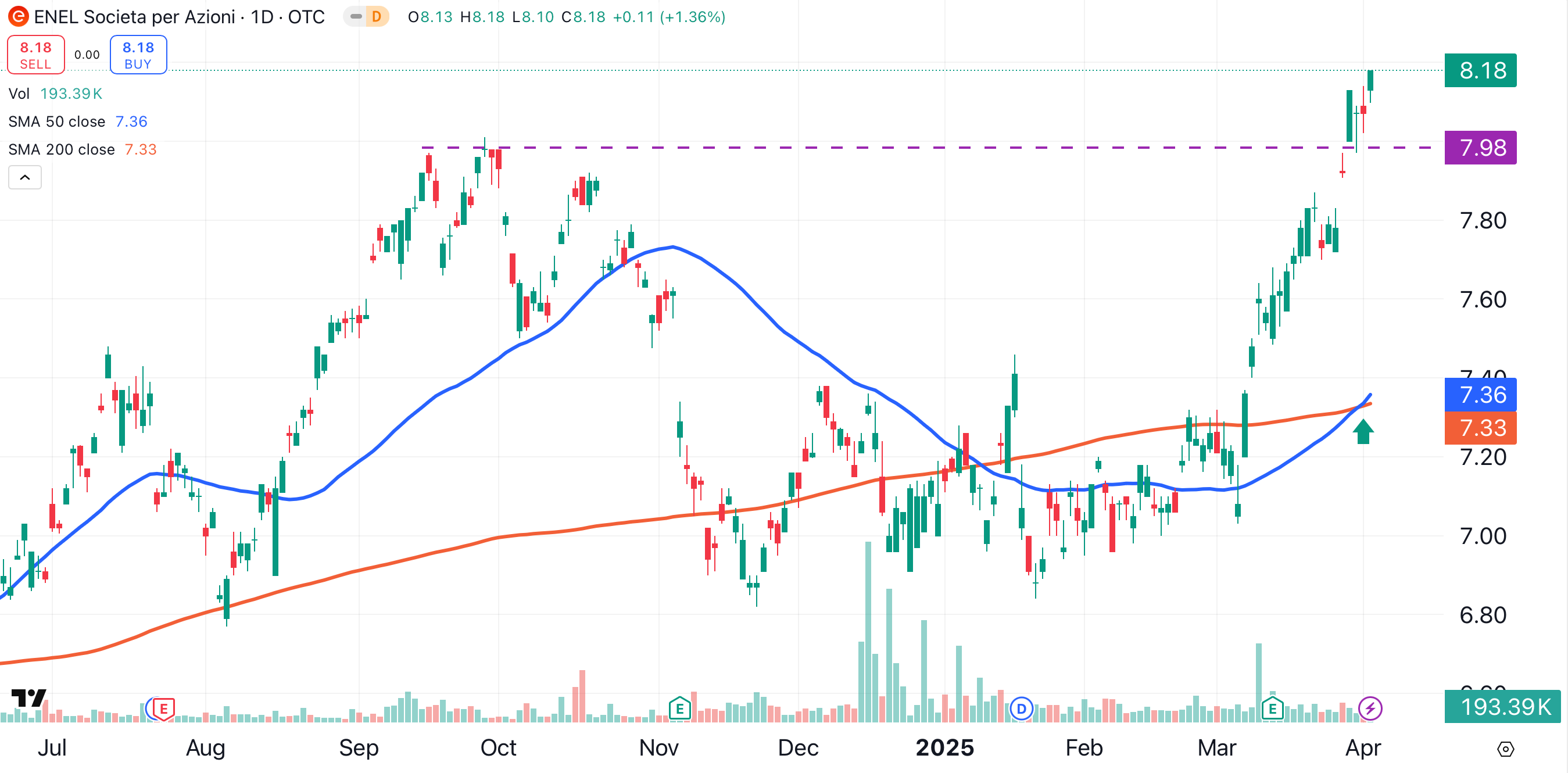 Right now shares of Enel are on a roll, having gained about 16% since March 7. In the process, the stock powered through significant resistance left from September/October of last year (purpledotted line).