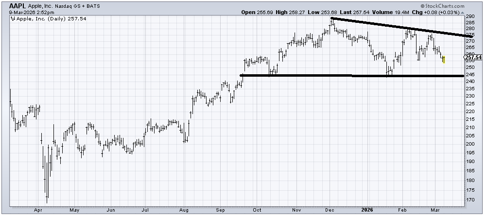 To me, Apple (AAPL) has been one of the sorts of charts that goes to sleep for long periods of time and then awaken and pushes upward for a while, then it rests and so on. Right now, it looks like a rest period. The fact that it hasn’t even visited the January low is a positive. So, unless it cracks under 245 in a big way, the stock is fine.