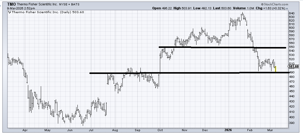 For now, I would call Thermo Fisher (TMO) a stock trapped between support at 490 and resistance at 550. A break of either and I’d have to re-assess.