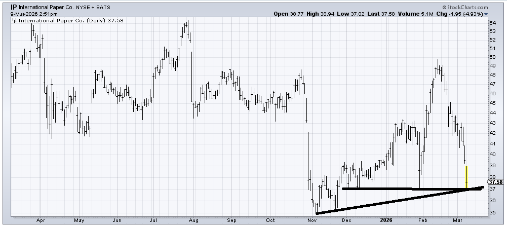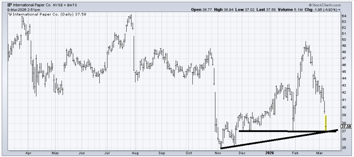 When International Paper (IP) was 40, I thought for sure the stock would pull back into that mid-40s area and hold and rally again. I was so wrong. But I guess this is part of the exodus out of the 493. The stock has good support in this 37 area, so I would expect it to bounce from here.