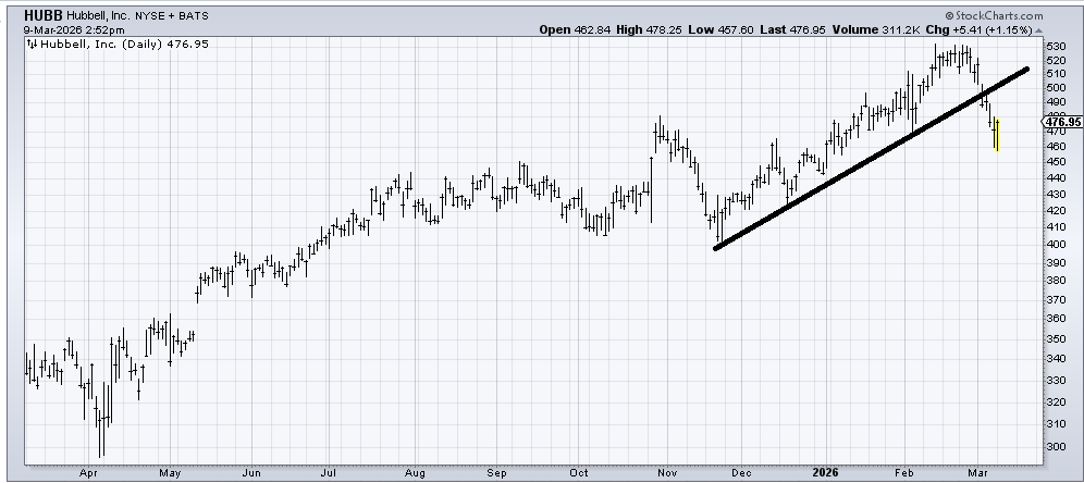 Hubbell (HUBB) broke that uptrend line, so I expect a rally back to it will be resistance. The good news is that there really is not a top in place, but a lower high would have me watching for the possibility there is a top building. For now, I’d look for resistance on a rally back to the line.