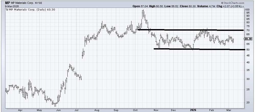 A few months ago, I recommended MP Materials (MP) . It rallied and then died, but I was asked if I thought it was still okay since it is not far from where I recommended it. It’s not a bad chart, and it would be even better if it can push itself up over 65. It will be dicey should it break 55. But yes, I still lean toward the positive side of the ledger on it.