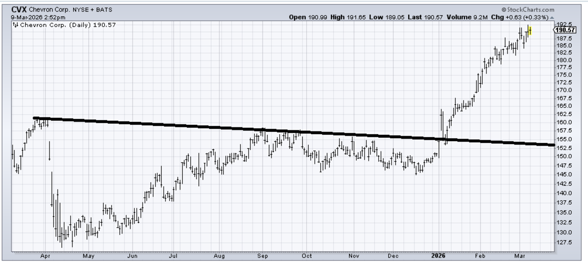 Chevron (CVX) has met its upside measured target, and as I discussed yesterday, I do not like the energy stocks up here. It is possible they pull back, and I will warm up to them again, but when the OIH is underperforming like this, XLE and the stocks that make it up (CVX is in it) are vulnerable.