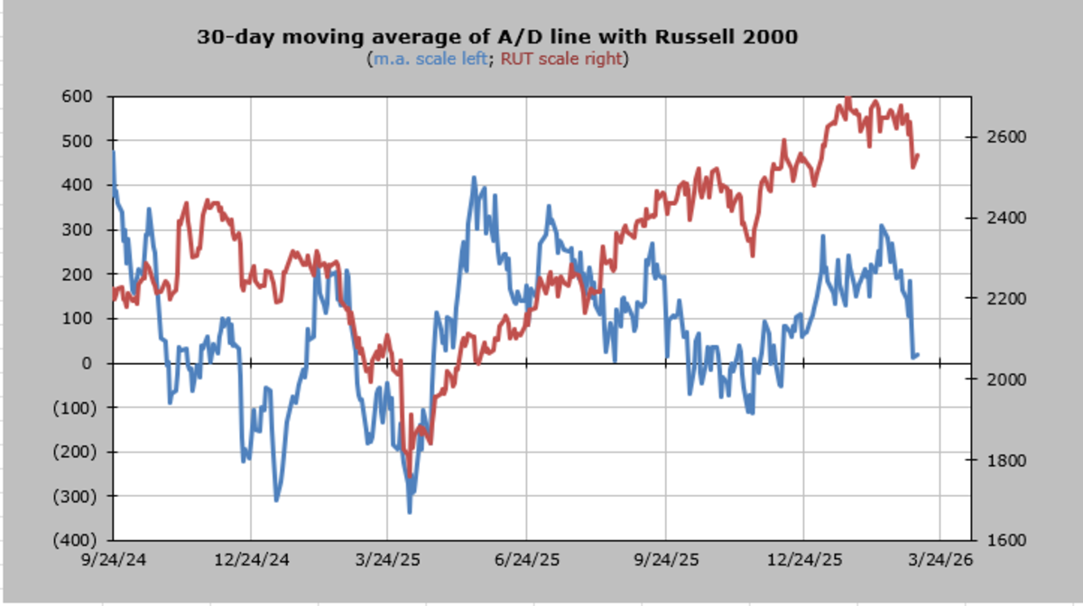 The 30-day moving average of the advance/decline line is no longer overbought. It looks like it is oversold, but the math behind it says it is not. In the next four weeks, there are only five red numbers to drop, and none are consecutive.