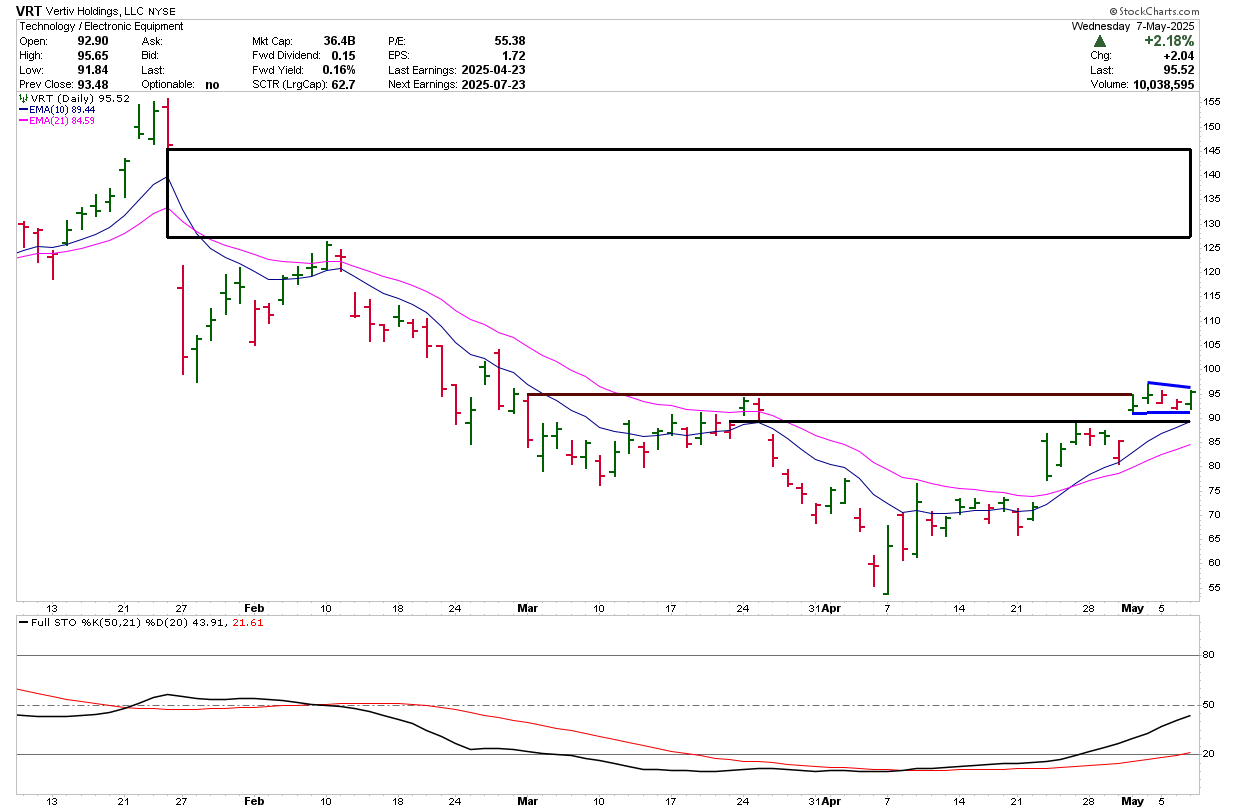 The market reacted strongly to the April 23 report. After the initial surge, Vertiv consolidated over a week’s trading before another gap higher. Once again, the stock is trading sideways, consolidating, offering another breakout setup.