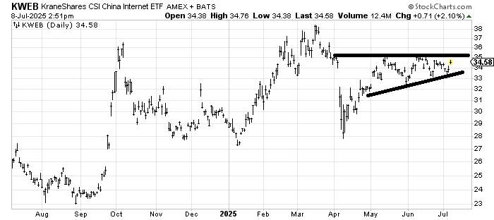 Last week, I said I thought Alibaba BABA should rally, and I think it has gone down every day since. Now I am asked about the Kraneshares CSI China Internet ETF KWEB, an ETF to be long Chinese Internet stocks. It has been trapped for two months in this range of 32-35, so unless it breaks in either direction, that’s the game. My inclination is that it should get over 35 eventually, but I will respect a break under 32-ish.