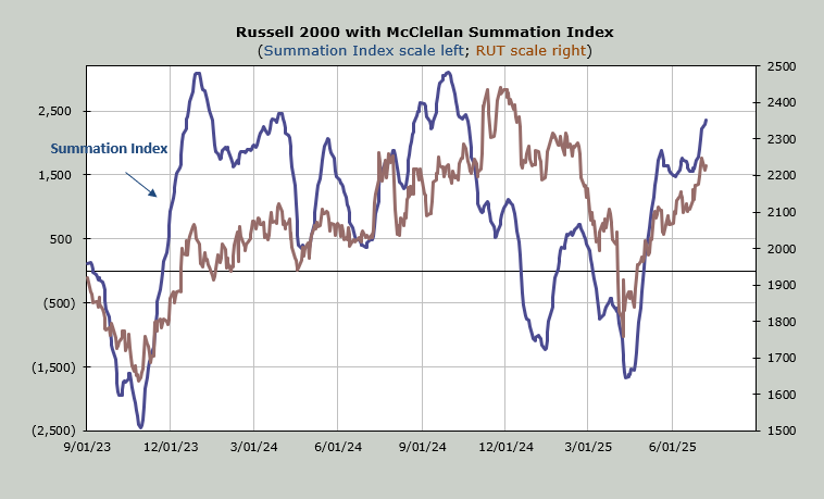 The McClellan Summation Index is still heading upward. The cushion is now -1000 advancers minus decliners on the NYSE. That means if breadth turns sour as it did on Monday, this will stop going up.