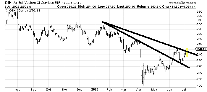 It’s been a long time coming, but OIH is trying to cross this second downtrend line. My initial target has been to fill that gap at 260 (from the April downdraft). Around there, it runs into some hefty resistance.