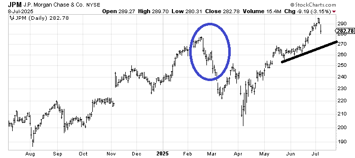 Now turn your eyes to the chart of JP Morgan JPM, another recent fan fave. There is support at 270-275, but does it grind sideways and then come down to tag that support? Corrections always start out like this. Sometimes they drop and stabilize and then rally again. And sometimes they do what they did in February (blue circle).
