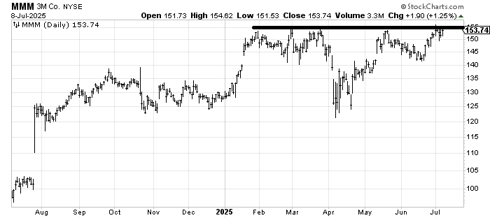 We looked at 3M MMM the other day as someone had inquired about it. I thought if the stock could go through this 156 area, it would be a nice breakout. The stock hasn’t done anything since we looked at it, but now it has piqued my interest, so I want to highlight it to you and follow up for the person who asked.