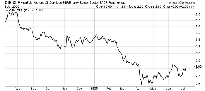 Not long before I left on vacation, I warmed up to the energy names. My vehicle of choice was the VanEck Oil Services ETF OIH. While it’s not been the greatest of trades (up about 12%), it’s not been terrible. But one of the reasons I liked it was because OIH had been outperforming the Energy Select Sector SPDR fund XLE, and when the high beta of the group does better than the low beta, I warm up.