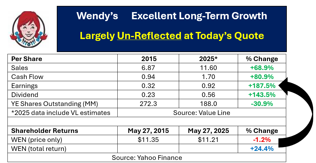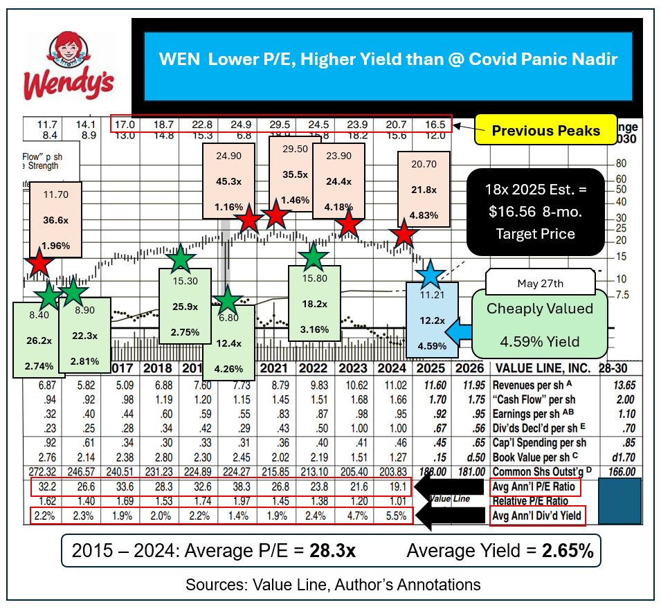 Despite those fine fundamentals Wendy’s shares dipped to a new post-2016 low of $11.16 intraday on May 27, 2025.