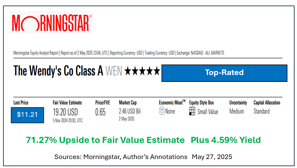 Research firm Morningstar rates WEN as a 5-star BUY while indicating a present-day fair value of $19.20 per share.