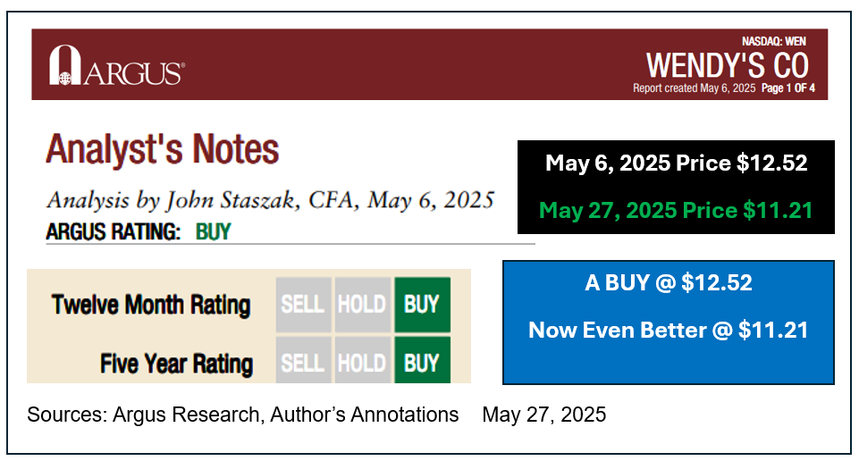 Argus Research called WEN a year-ahead and 5-year-out buy on May 6 when it fetched $12.52. It is an even better buy now, at $11.21.