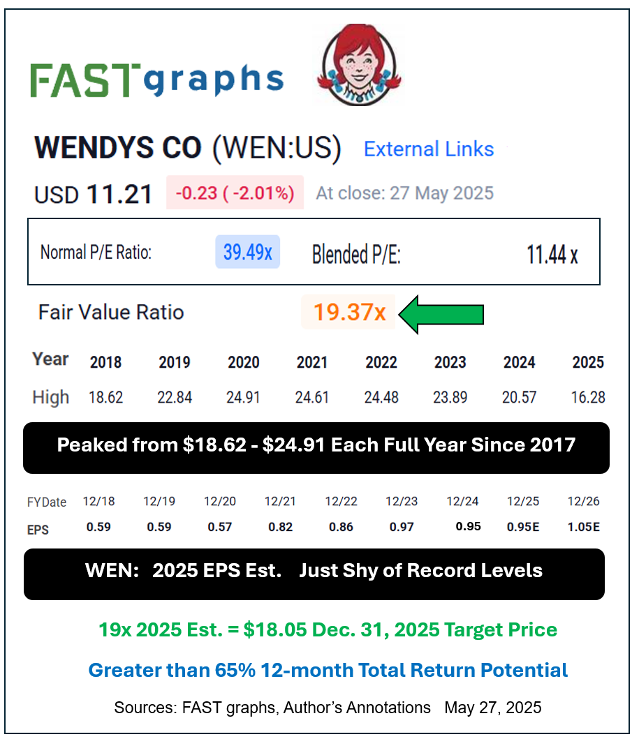 Quantitatively-based FAST graphs’ view calls Wendy’s fair value multiple as 19.37x. Reverting to near that very achievable level could easily send WEN shares back up to around $18.