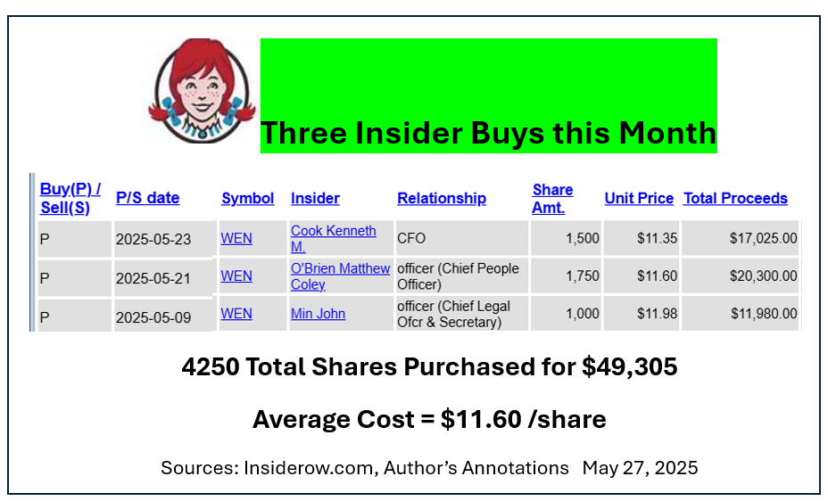 All these positive outlooks are confirmed by three insider buys in Wendy’s since May 5.