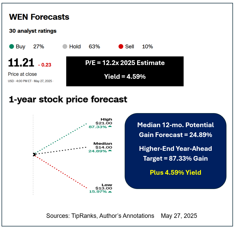That implies about 48% upside by next winter plus around 3.7% from three dividend payments. Note: WEN goes ex-dividend for 14 cents next Monday. Buyers this week will earn five payments while holding just over one year.