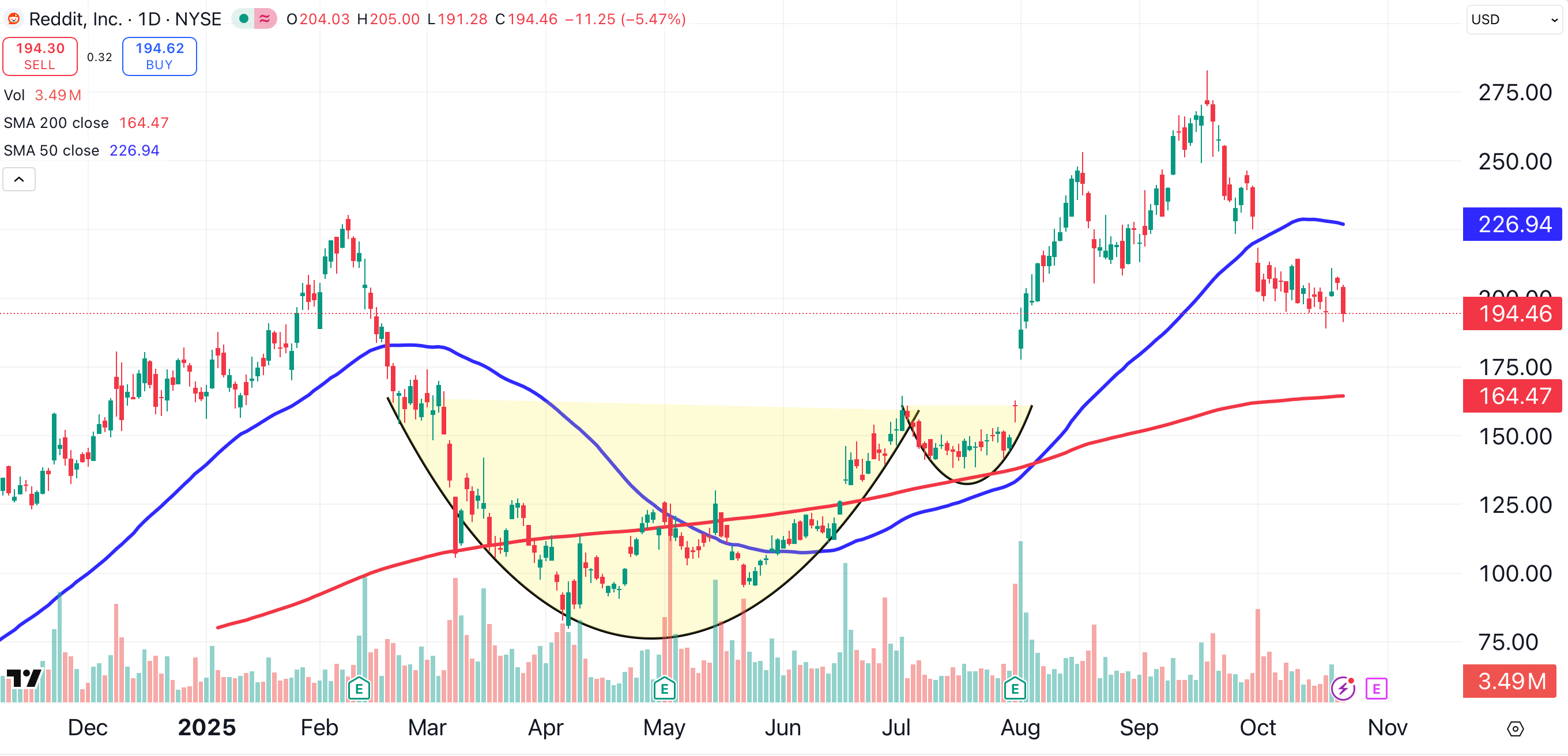Now Reddit is sagging. The stock has fallen beneath its 50-day moving average (blue). Reddit’s earnings are scheduled to be reported in just one week. Now seems like a good time to lighten this position.