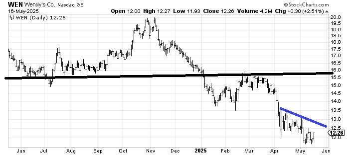 Wendy’s WEN has a chart only a mother could love (My mother loves their Frosties!) The chart did reach a measured target when it tagged $12 so it ought to start improving from here considering it has tried to break $12 three times now and has been unsuccessful at doing so. Crossing that blue line would be the first step in proving the bottoming process.