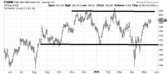 I would consider the chart of Palo Alto Networks PANW in a trading range between $205 and $165.